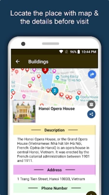 Apart from this, Vietnam Travel & Explore guides you Why, When and How to visit various places in Vietnam with precise location on the detailed Map. There are three ways to explore this app - Category view, City view and EduBank favorite places view. Pin your destinations and get the routes on the Map. Not only this, you can see exactly how the places look like with Street View integrated in this app. The app also has a feature to Rate and write Review/Experience regarding entity(s) through Login. Your Travel experience and rating will help the user community.